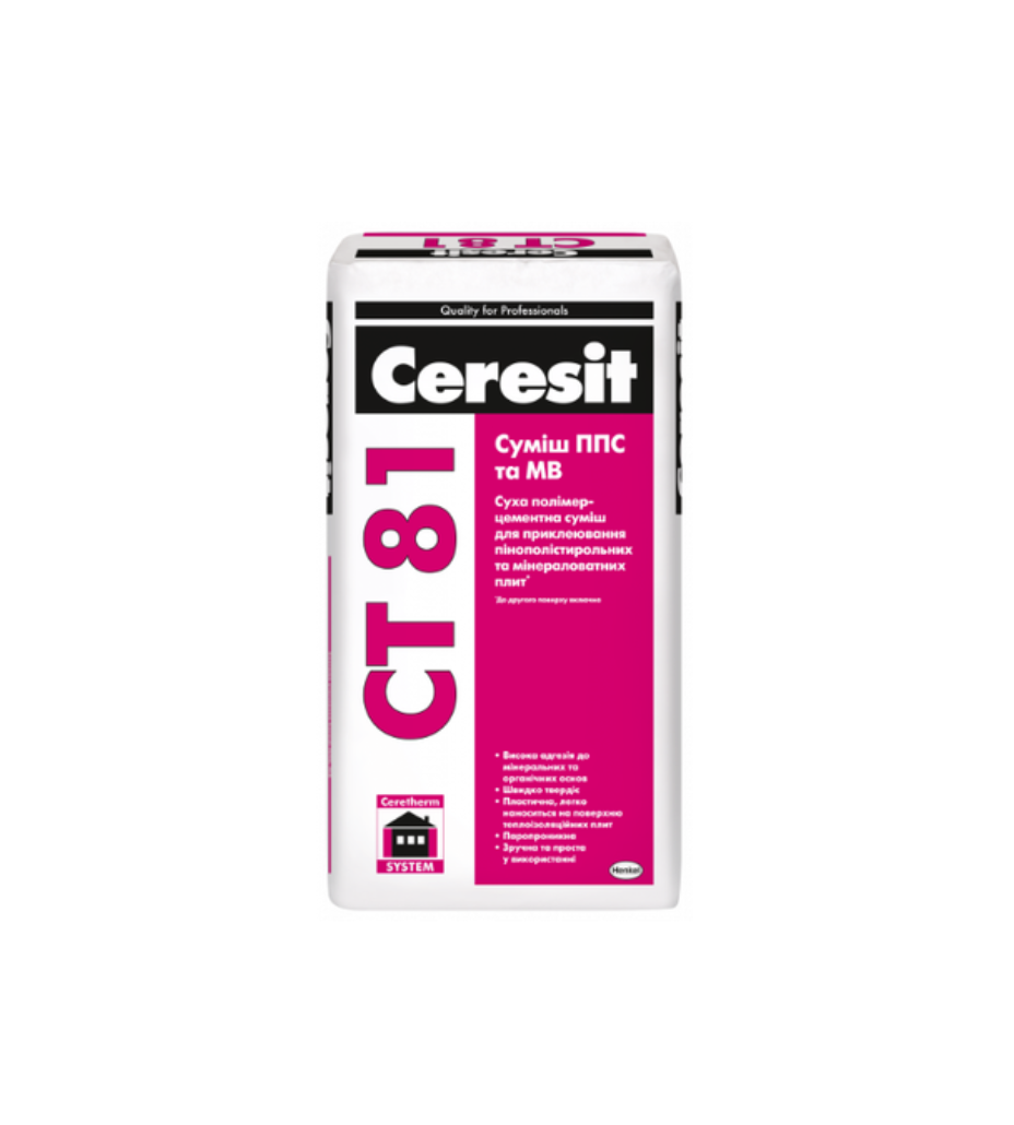 Cуміш Ceresit СТ 81 призначена для приклеювання пінополістирольних та мінераловатних плит при утепленні фасадів будівель і споруд до двох поверхів включно.